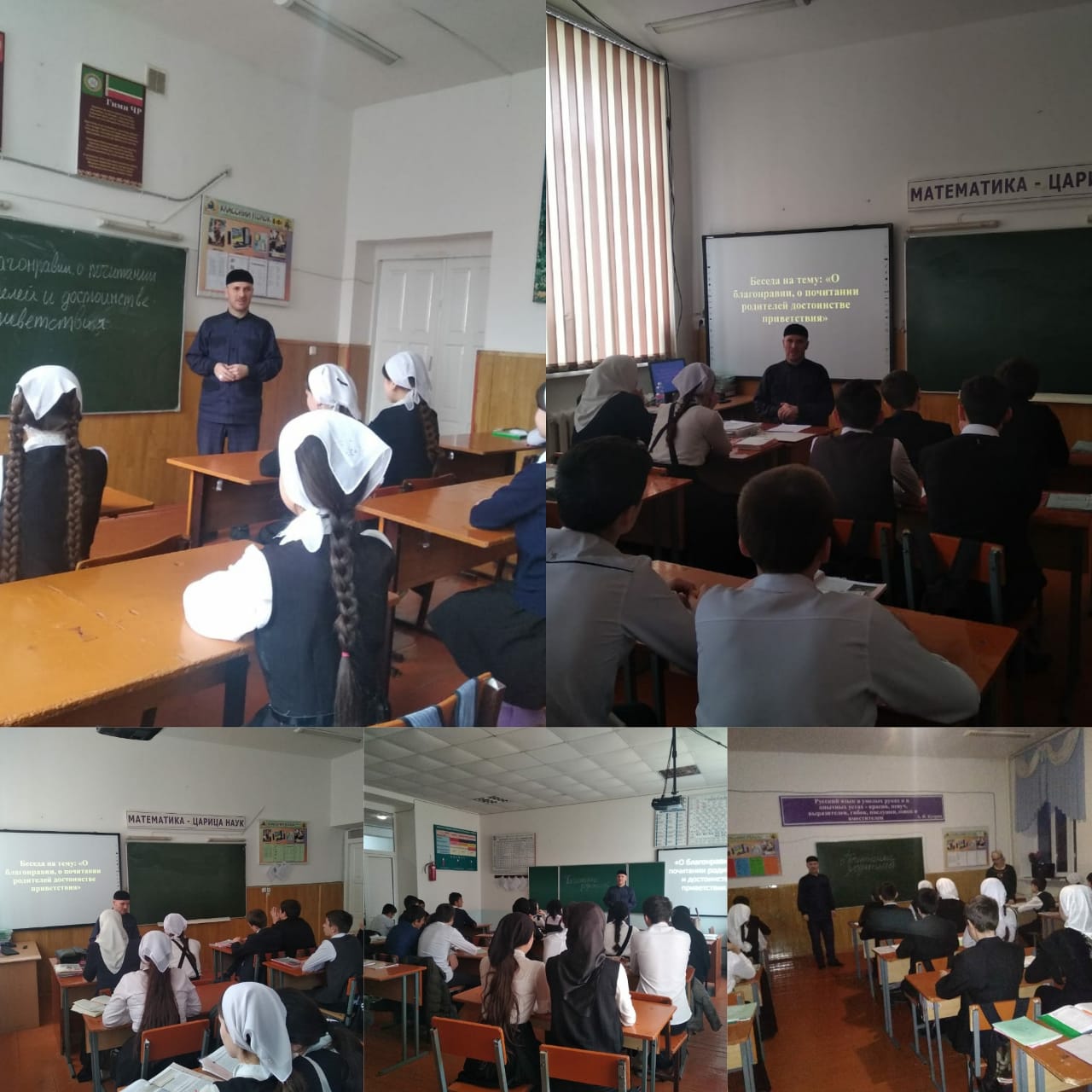 11.12.2019С целью формирования жизненно ценных ориентиров, основ духовно нравственной культуры 11.12.19 г. проведена беседа педагогом-организатором по ДНВ Халадовым А.Н. в 5-11 классах на тему: "О благонравии, о почитании родителей, достоинстве приветствия".