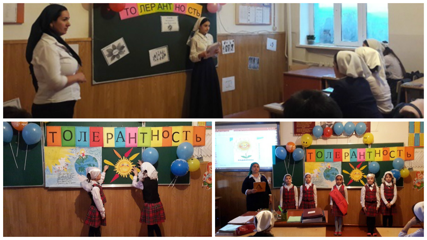 На классных часах были проведены беседы на тему: «Толерантность сегодня- мир навсегда». Открытые кл. часы проведены во 2а классе (кл. рук. Эдилова А.Р.).