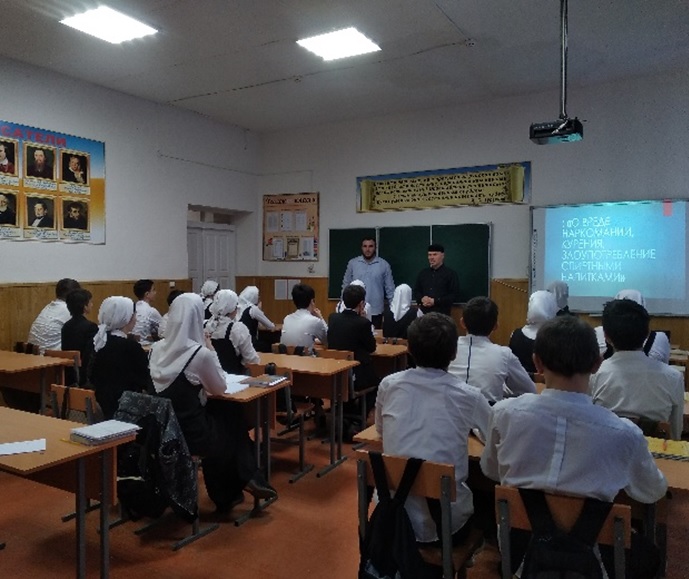 18.03.202218.03.2022 г. педагогом по ДНВ Халадовым А.Н. проведены беседы вместе с педагогом-психологом Музаевым М.М. и учителем ОБЖ Ибрагимовым Б-А.Д. с учащимися 7-11 классов на тему: «О вреде наркомании, курения, злоупотребление спиртными напитками».