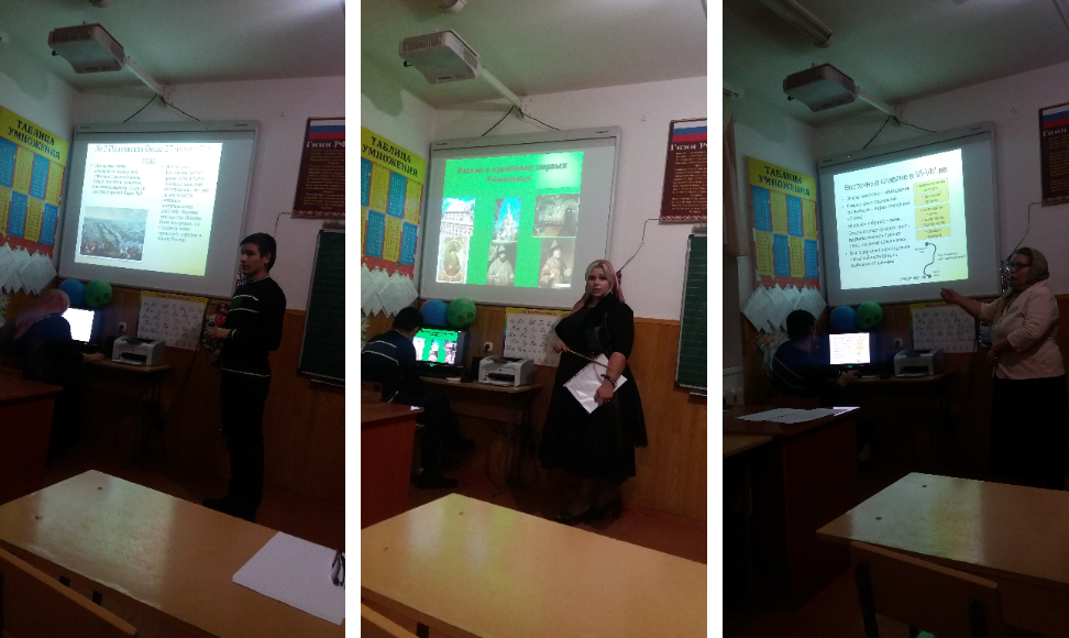 29.11.2017Выступил учитель истории Юсупова Э.А. с темой: «Основные явления и процессы, характерные для истории России IX- XV вв.». Выступил учитель истории Майрбекова Д.Р. с темой: «Основные явления и процессы, характерные для истории России XVI-XVII вв.». Выступил учитель Гехаев Л-А. Т-А. с темой: «Основные явления и процессы, характерные для истории России в конце XVII-XVIII вв.».