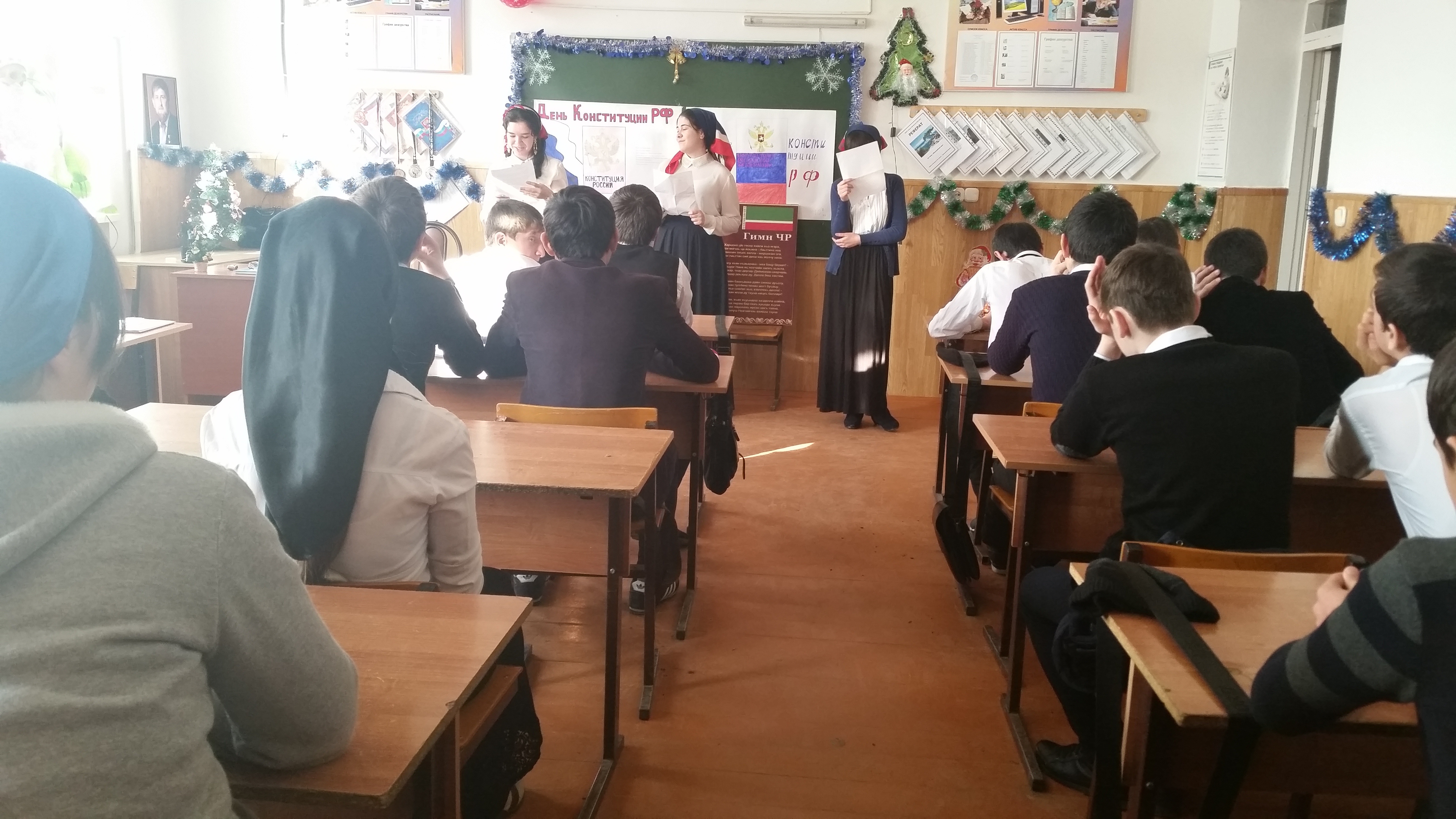 В мероприятиях приняли участие обучающиеся 1-11 классов.Учителями истории для обучающихся были проведены: в 7-х классах исторический час «Героями ты славишься, а в 11кл. проведен урок на тему «Всеобщая декларация прав человека».Цель урока: познакомить учащихся с Конституцией РФ.Задачи урока: познакомить с понятиями: гражданин РФ, Конституция, государственные символы страны;развивать интерес к истории нашей страны; воспитывать уважение к символам государства.Целью данных уроков являлось: познакомить обучающихся с историей праздника; подчеркнуть значимость событий для дальнейшей истории нашей страны; воспитывать чувство патриотизма, любви к Родине.Библиотекарем школы организована книжная выставка «Наши подвиги и доблести». В ходе мероприятий обучающиеся познакомились с историей возникновения праздника, подвигами наших предков во имя независимости Родины.С 08.12. по 12.12.14г. проведены классные часы на тему «Я-гражданин РФ».Открытый кл. час в 10б классе на тему «Конституция РФ».10.12.14г. в целях физического воспитания детей учителем физической культуры Мусаевым У.А. среди 9-11 классов проведен дружеский матч по волейболу.Выиграла команда 10а класса.Проведенные мероприятия стали возможностью напомнить нам всем о наших общих корнях, в полной мере осознать, что единство народов во все времена было и остаётся главной национальной идеей России, залогом её достойного будущего.